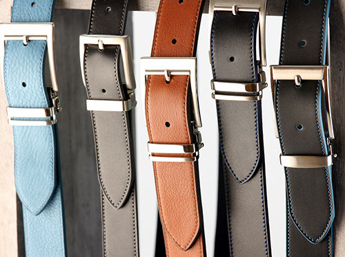 Possibilité de choisir la boucle, la largeur de bande de cuir, les cuirs pleine fleur (veau lisse, légèrement grainé, taurillon nubuck), les couleurs de cuir, la couleur de couture, la couleur de tranche, la taille.
